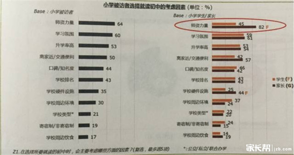数据显示,小升初选择学校时,大家最看重的还是各个初中的“师资力量”,老师水平高低是关键。特别是家长,相比学生本人,对学校的师资情况更加看重。“学习氛围”是次要考虑要素,也是学生在选择所要就读初中时的最主要考虑因素。好的学习氛围,有助于良好学习习惯的养成和学习成绩的提高。此外,“升学率”和“离家远近”也是主要考虑因素之一。