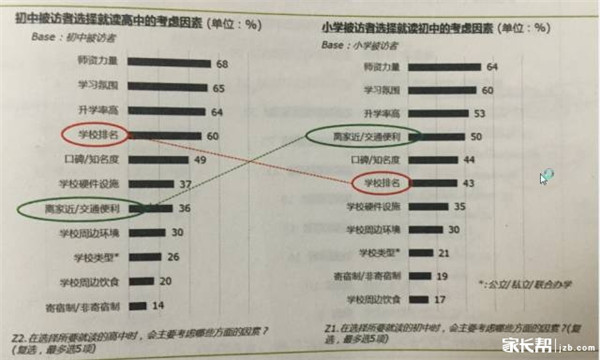 调查还发现,初中生考虑所要就读高中时的学校选择与小升初时相似,但由于高中阶段学习目的以升学为主,因此“学校排名”取代小升初时考虑的“学校离家远近”,成为重要考虑因素之一。