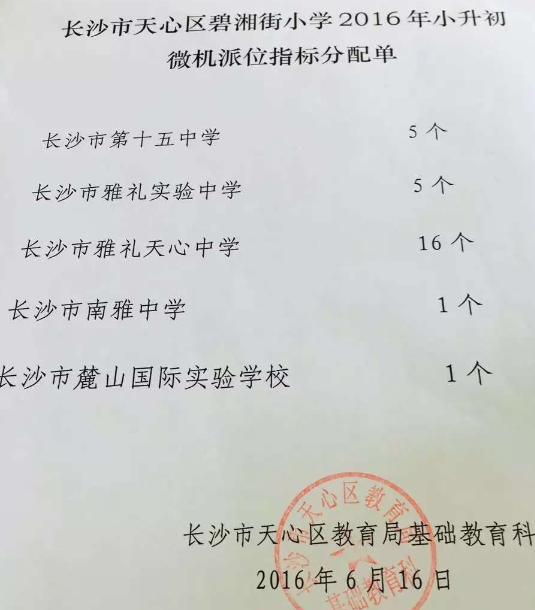 2016长沙天心区碧湘街小学小升初微机派位指标
