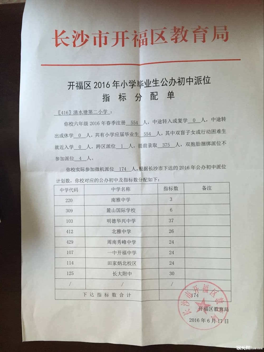 2016年长沙开福区第一小学小升初微机派位指标分配
