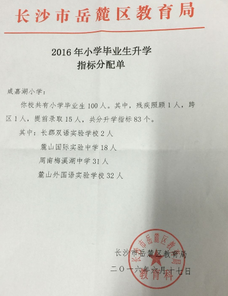 2016长沙岳麓区咸嘉湖小学小升初微机派位指标