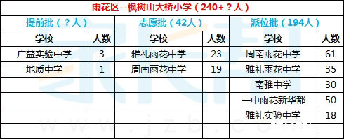 长沙奥数网:枫树山大桥小学毕业生人数应该在280~320人,但只公布了240人的录取情况,未公布学生主要集中在提前批,以下数据仅供参考。
