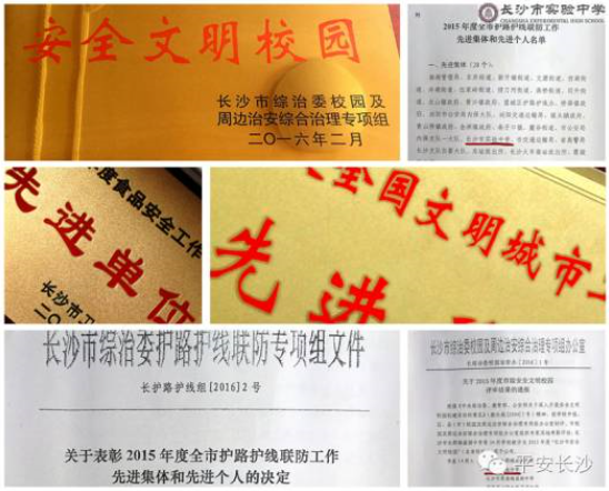经过多年努力,通过一系列切实有效的管理方式和严格落实的安防制度,长沙市实验中学平安校园工作获得长沙市综治委校园及周边治安综合治理专项组充分肯定,于2015年荣获“长沙市安全文明校园”以及“全市护路护线联防工作先进集体”荣誉称号。