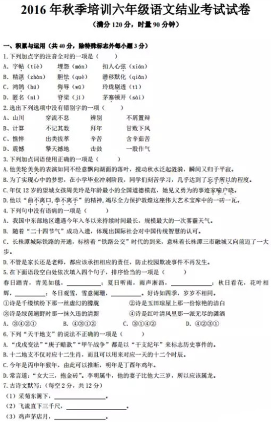 2017年长沙雅礼系坑班秋季结业考语文试卷