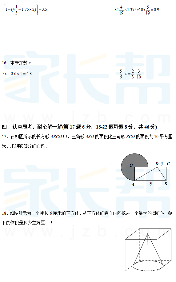 2015年长沙青竹湖湘一小升初数学真题及答案(3)