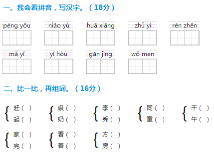 晚——( ) 假——( ) 丑——( ) 收——( ) 阴——( ) 哭——( )