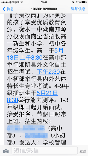 有家长发的短信截图,不知道是不是收到学校发来的短信了衡水来湖南开分校了,在湘阴。各位家长有兴趣让孩子去读吗?