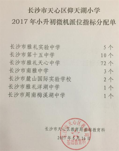 2017年长沙仰天湖小学小升初微机派位指标 家长帮长沙站 2017-06-16 20:57:00 2017年长沙仰天湖小学小升初微机派位指标 编辑推荐: 2017年长沙各校小升初微机派位指标汇总 2017长沙小升初微机派位志愿填报注意事项 长沙微机派位到底是怎样的操作方式?