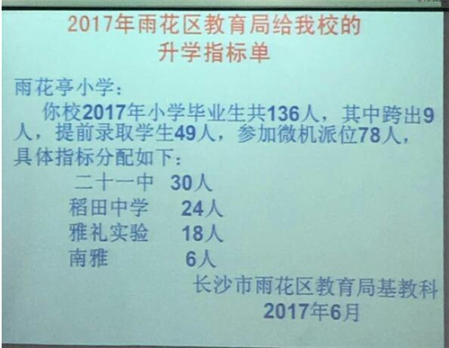 2017年长沙雨花亭小学小升初微机派位指标 家长帮长沙站 2017-06-16 21:04:46 2017年长沙雨花亭小学小升初微机派位指标 编辑推荐: 2017年长沙各校小升初微机派位指标汇总 2017长沙小升初微机派位志愿填报注意事项 长沙微机派位到底是怎样的操作方式?