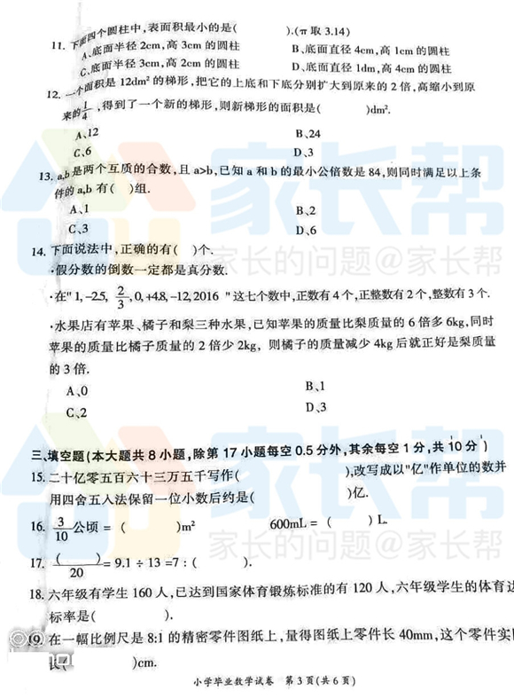 2017年长沙小学毕业考试数学试卷(3)