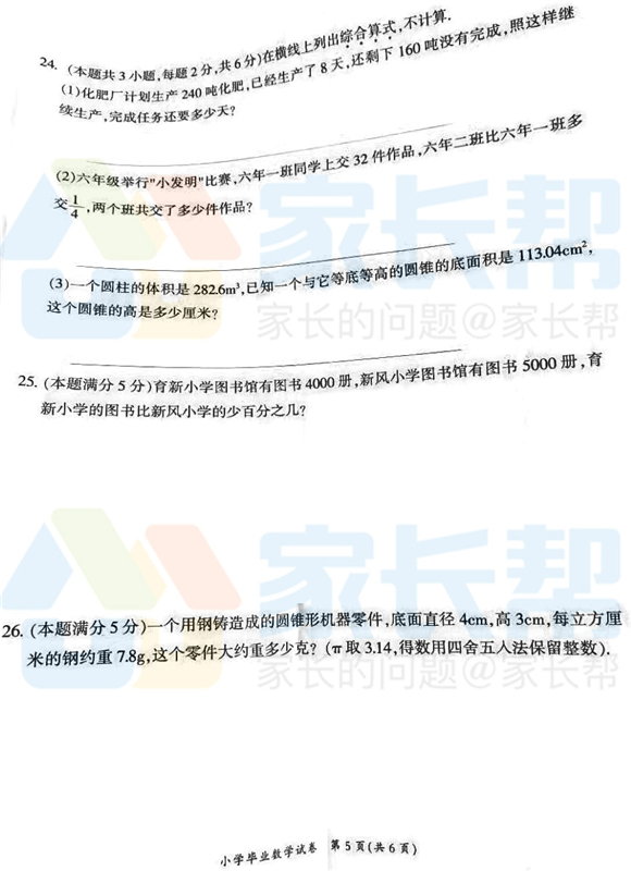 2017年长沙小学毕业考试数学试卷(5)