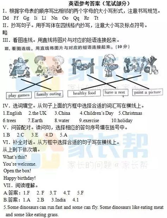 2017年长沙小学毕业考试英语试卷答案