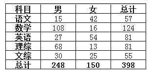 1、语文和英语,女生占绝对优势,女生人数超过男生人数一倍还要多。