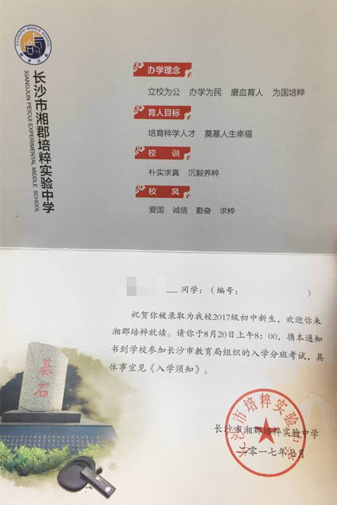 长沙湘郡培粹中学2017年录取通知书