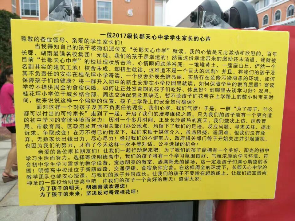 之前安排在桂花坪小学寄读,后来有部分家长上访维权后,今天开会给三个学校(明德中学,披塘中学,桂花坪小学)投票,最终明德中学票数最高,今年新生就定在明德中学寄读。