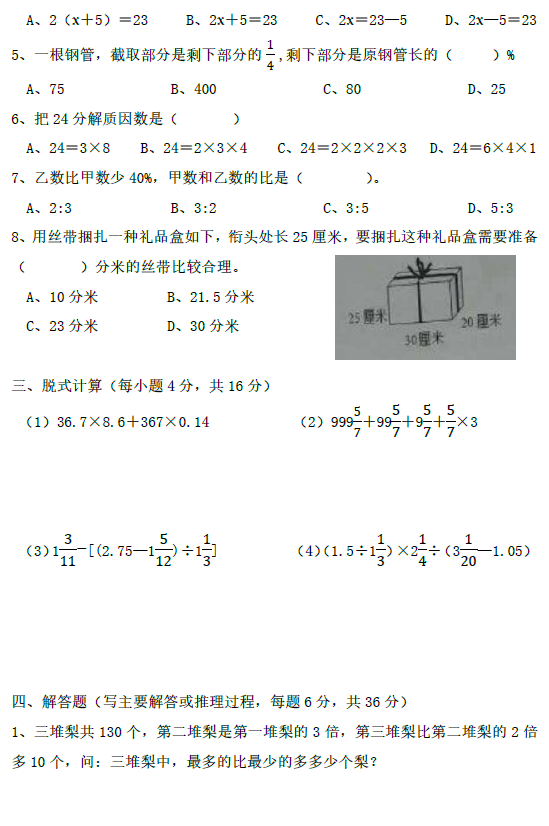 2017.10.7长沙青竹湖湘一小升初数学试卷(2)