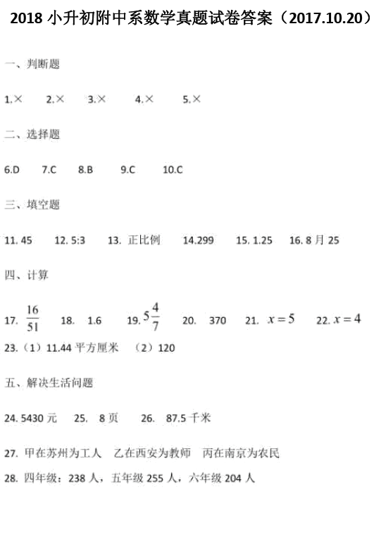 2017.10.20长沙广益中学小升初数学试卷答案
