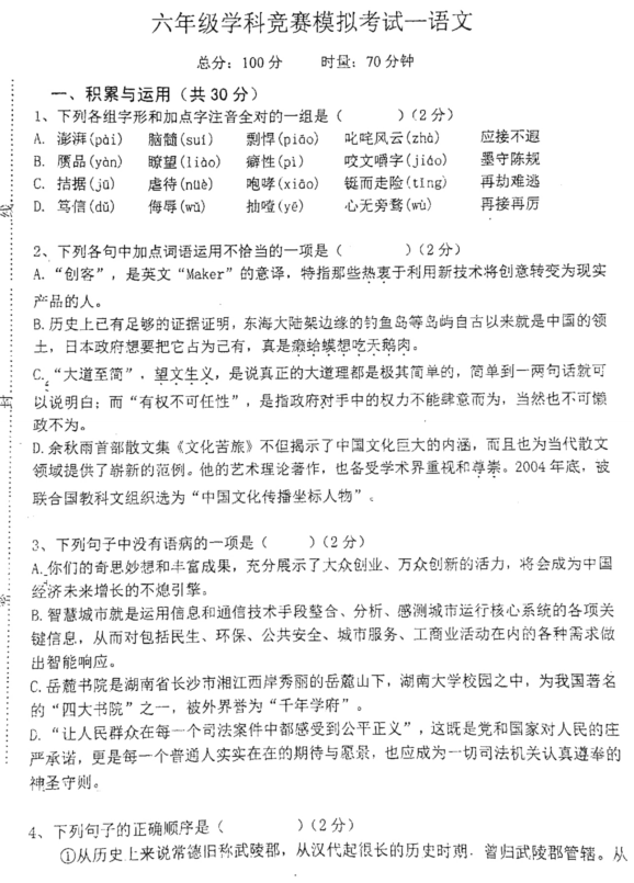 2017.10.28长沙湘郡郡维小升初语文试卷