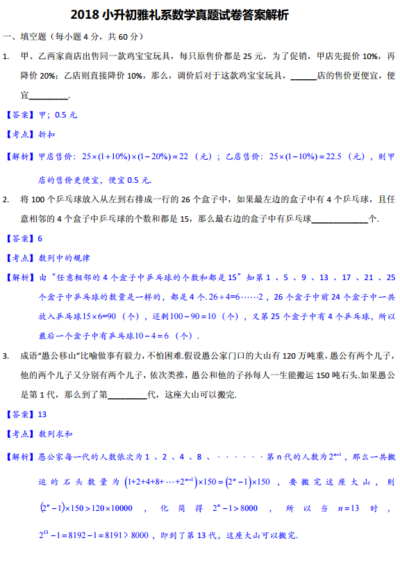 2018年长沙中雅培粹小升初数学试卷答案