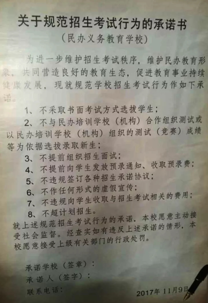 长沙小升初规范民办招生考试行为承诺书