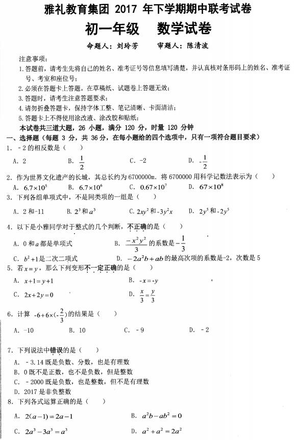 2017年秋长沙雅礼系初一期中联考数学试卷