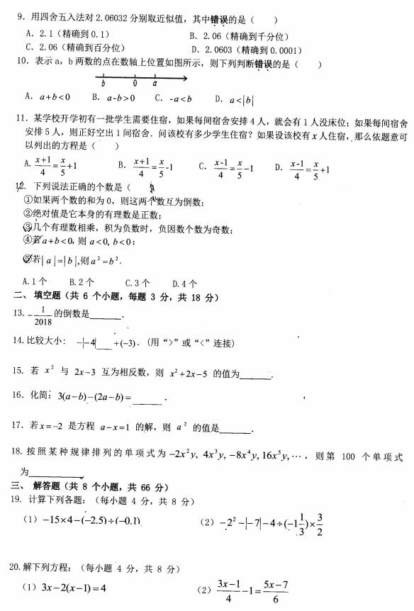 2017年秋长沙雅礼系初一期中联考数学试卷(2)