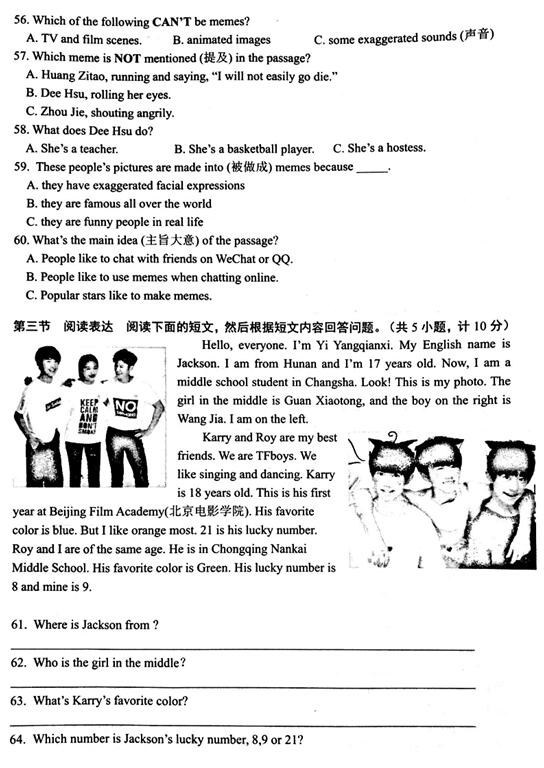 2017年秋长沙雅礼系初一期中联考英语试卷(7)