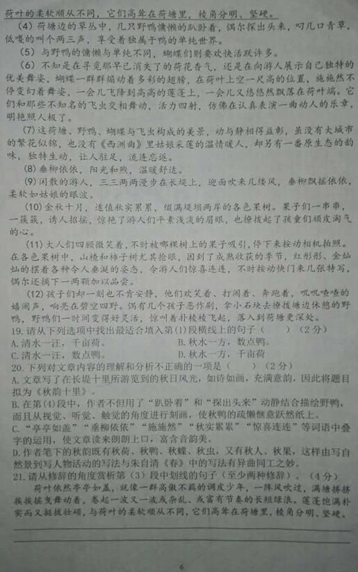 2017年秋长沙雅礼系初一期中联考语文试卷(6)