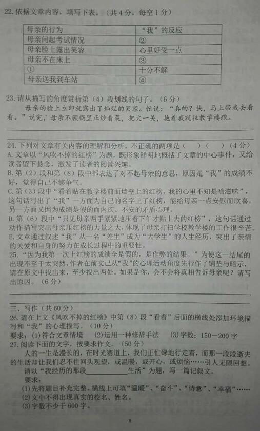2017年秋长沙雅礼系初一期中联考语文试卷(8)
