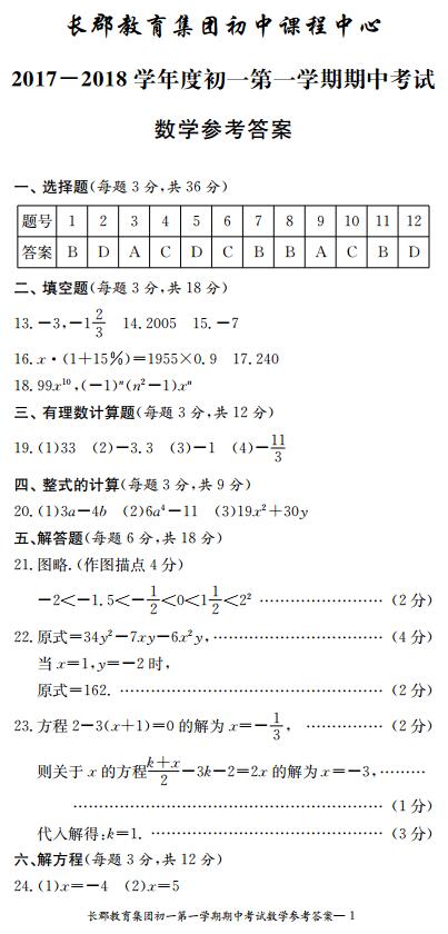 2017年秋长沙长郡系初一期中联考数学试卷答案