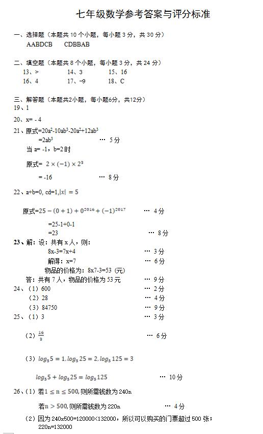2017年秋长沙明德系初一期中联考数学试卷答案
