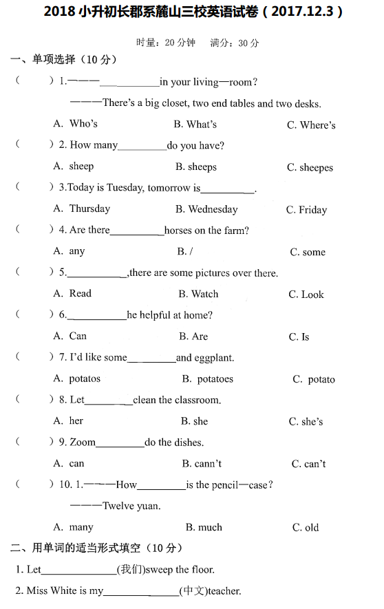 2017.12.3长沙麓山外国语小升初英语试卷