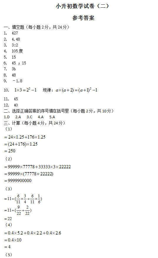 2017年长沙湘郡金海小升初数学试卷答案(二)