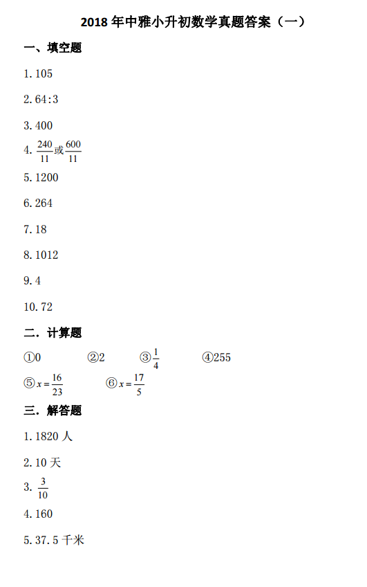 2018年长沙小升初中雅直录数学试卷答案