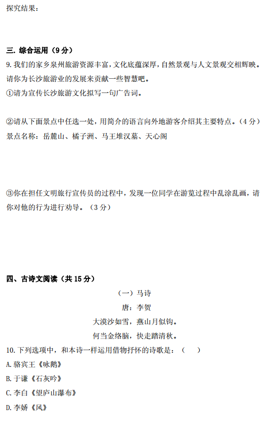 2018年长沙小升初中雅直录语文试卷(3)
