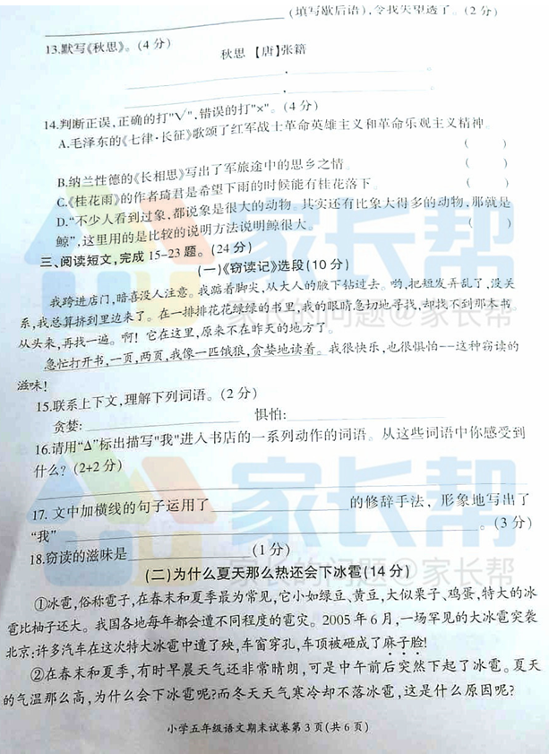 2017学年长沙芙蓉区五年级上期末语文试卷(3)