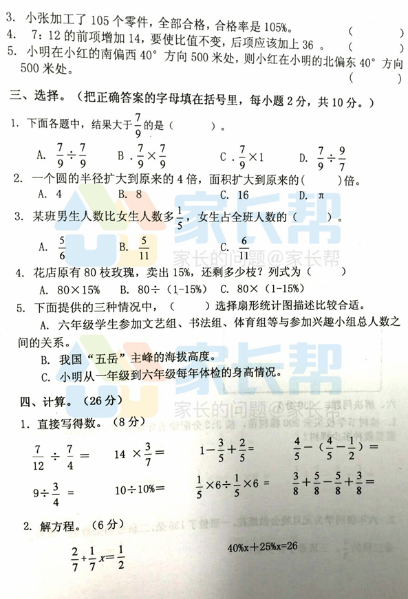 2017学年长沙高新区六年级上期末数学试卷(2)