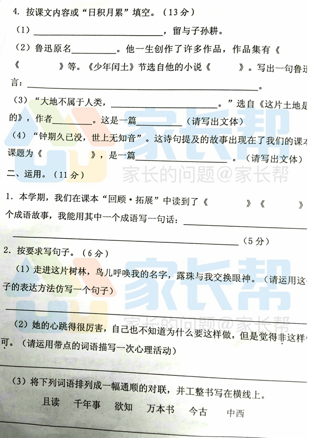 2017学年长沙雨花区六年级上期末语文试卷(2)