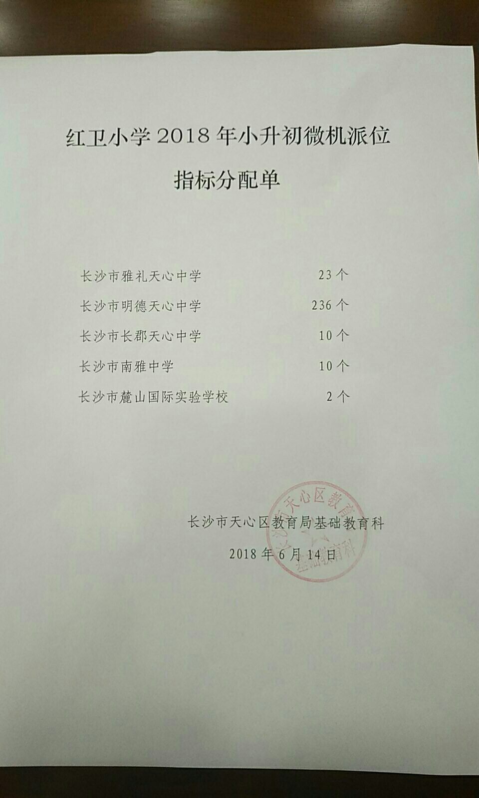2018年长沙天心区红卫小学微机派位指标