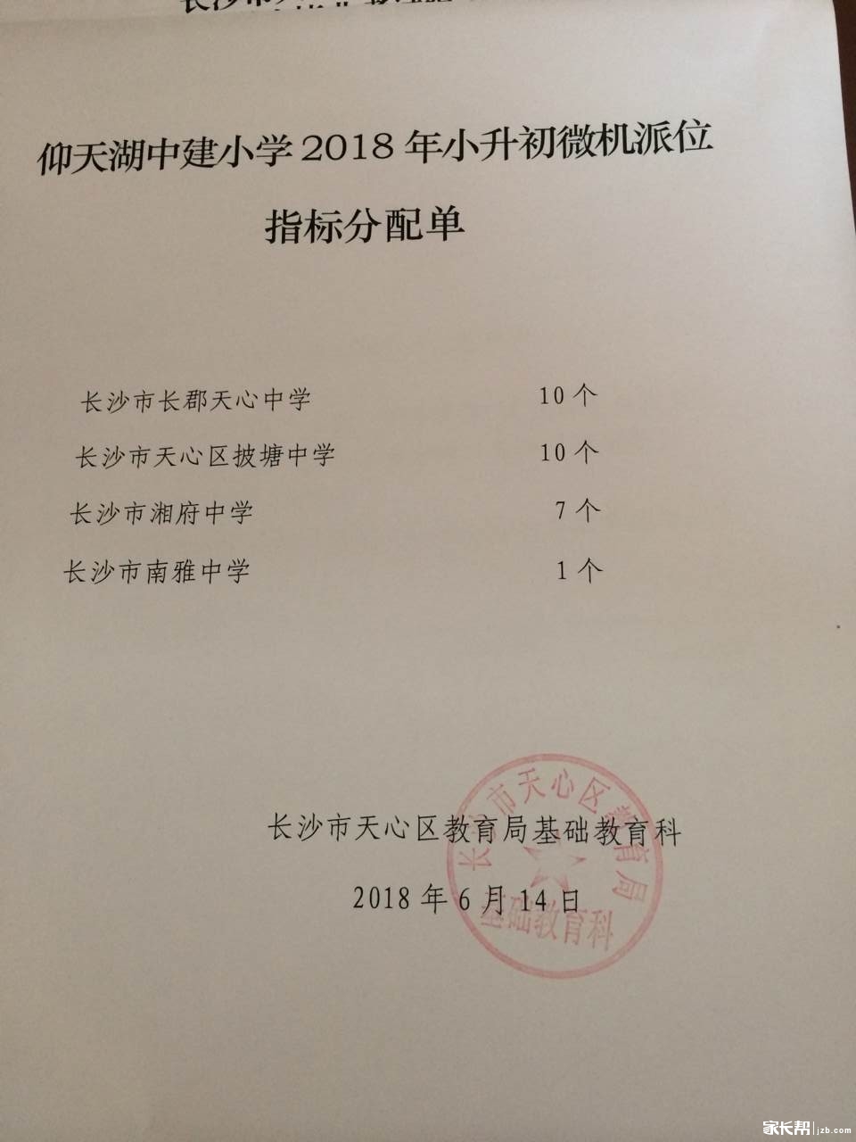2018年长沙天心区仰天湖中建微机派位指标