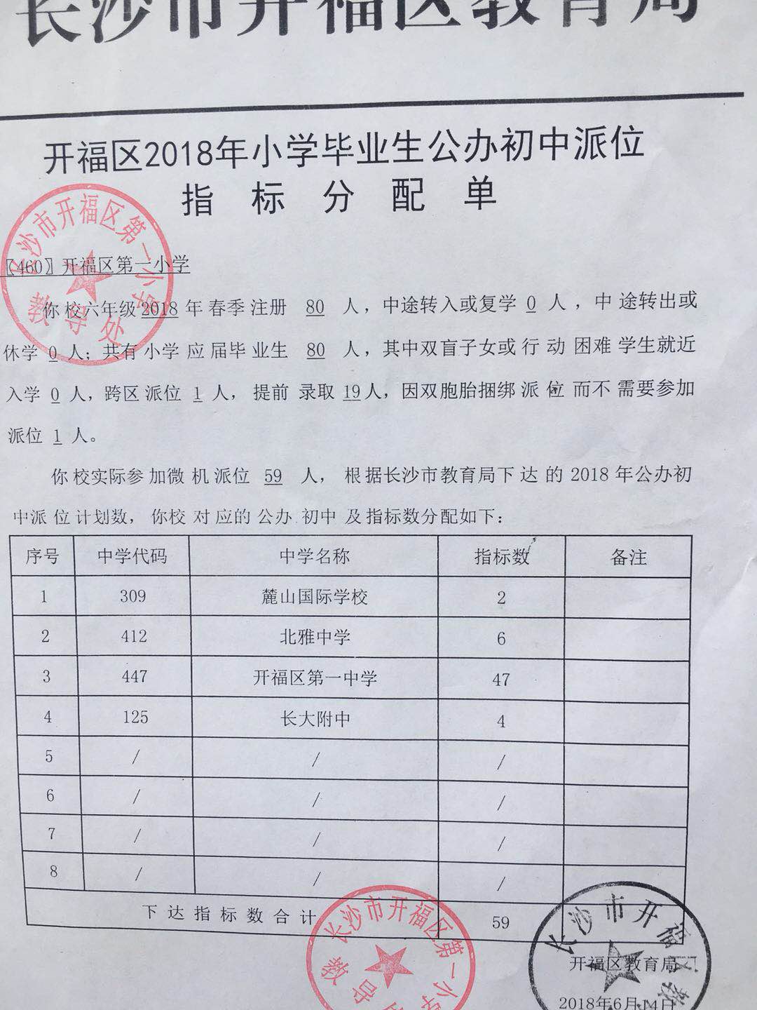 2018年长沙开福区一小微机派位指标