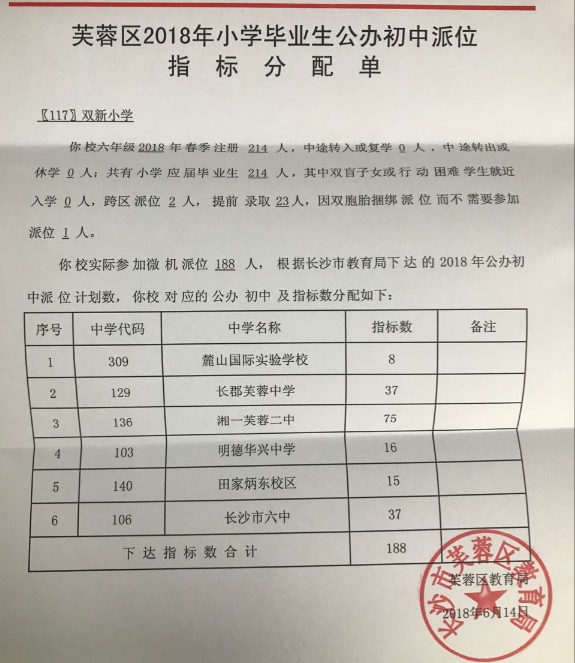 2018年长沙芙蓉区双新小学微机派位指标