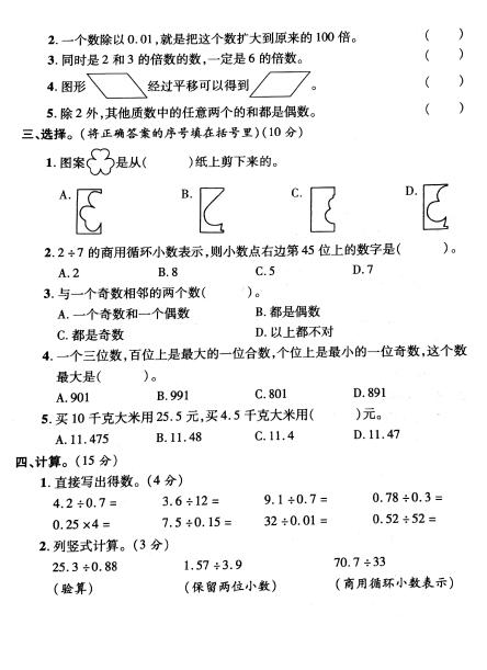 新课标版五年级上册数学期中考试卷三(图片版)(2)