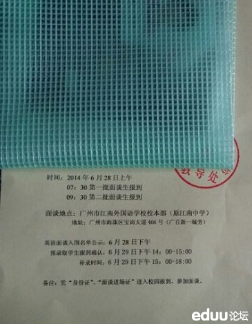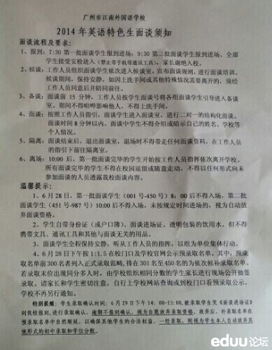 广州奥数网:江南外国语学校是分两批面试的,第一批7:30进场10点出来,第二批9:30进场12点出来。小编温馨提醒大家如果想第一批的可在今天去领,想第二批的周六再去。