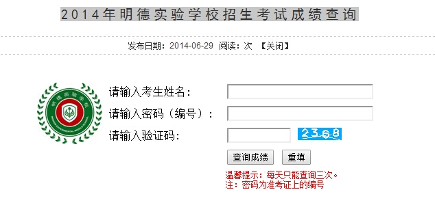 2014年明德实验学校招生考试成绩查询页面已经开放啦。