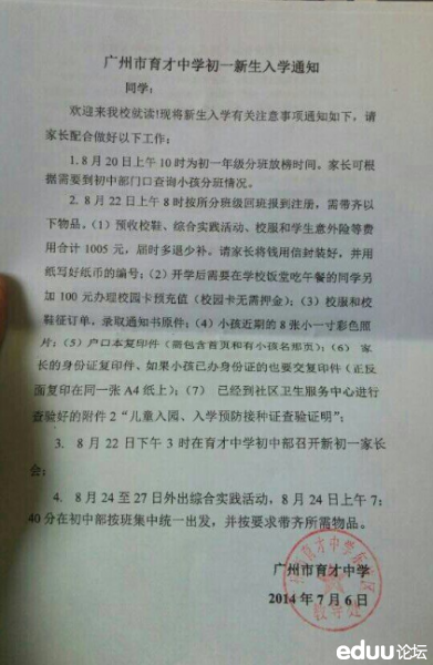 【查看原帖并参与讨论:2014年广州市育才中学初一新生入学通知】