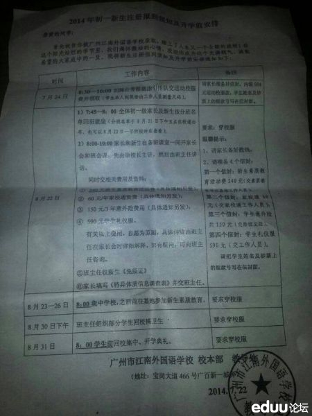 2014江南外国语新生注册报到须知及开学安排 家长帮社区 2014-07-23 19:54:10 广州奥数网:2014年江南外国语学校初一新生注册报到须知及开学前安排,详情如下: 【查看原帖并参与讨论:2014年江南外国语学校初一新生注册报到须知及开学前安】 编辑推荐: 2015小升初备考;保持小升初优势 广州中考盘点:特色学校、民办高中最抢眼