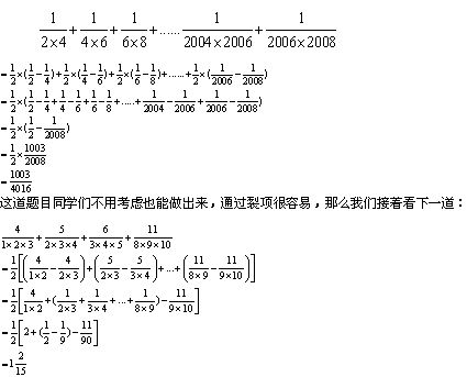 你想到了吗?毫无疑问,也是裂项,不同的是分母变成了三个因子的乘积,如果你想到了上面那道题,就知道应该把分母转化成两项,这道题目就有眉目了,在按照裂项来分析一些细节,题目就迎韧而解了!