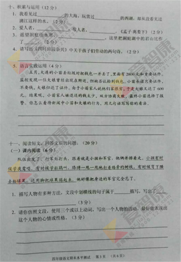 2017年广州天河区四年级下学期语文期末试卷(3)