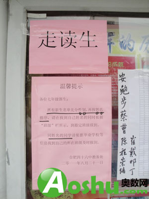 2011年,七年级新生一共22个班级,1-14班为区内学生,即走读生。从15班到22班为区外特长生,即全部需要住宿的学生。学校按照走读生和住宿生两种生源标准在橱窗处张贴出学生分班信息,以学生姓名首字母拼音的顺序对号入座。